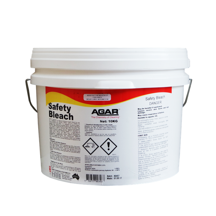 SAFETY BLEACH is an effective oxygen bleach/detergent powder which brightens colours, removes stains and kills germs. It is used in the laundry and also as a pre-soaker in the kitchen.