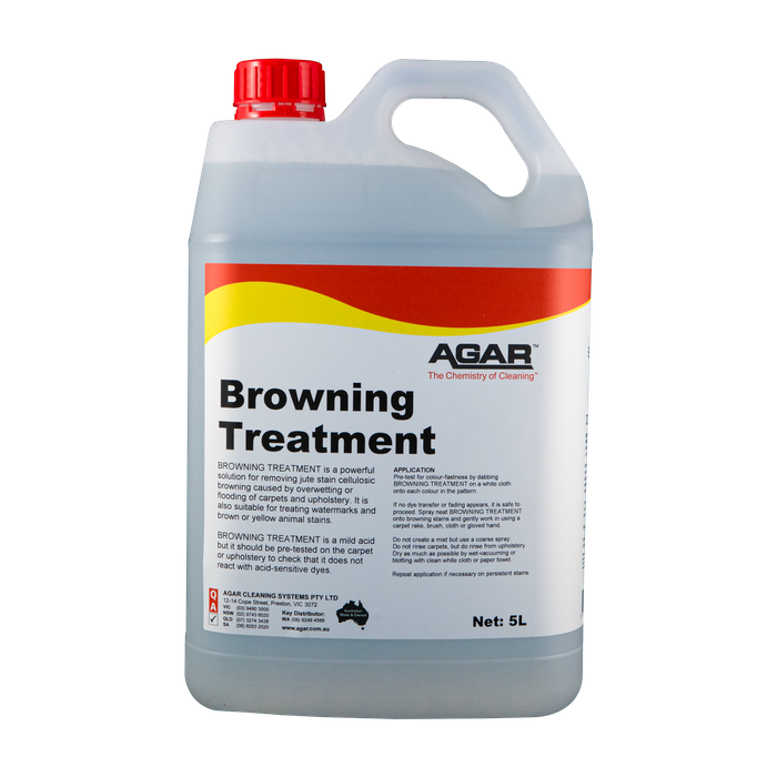 BROWNING TREATMENT is a powerful liquid treatment for removing jute stain cellulosic browning caused by overwetting or flooding of carpets and upholstery.