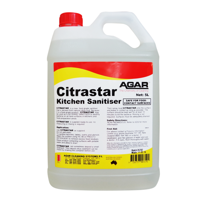 CITRASTAR is a food-grade sanitiser that is derived from natural citrus fruit. It may be used to destroy bacteria on all hard surfaces in kitchens and food-preparation areas.