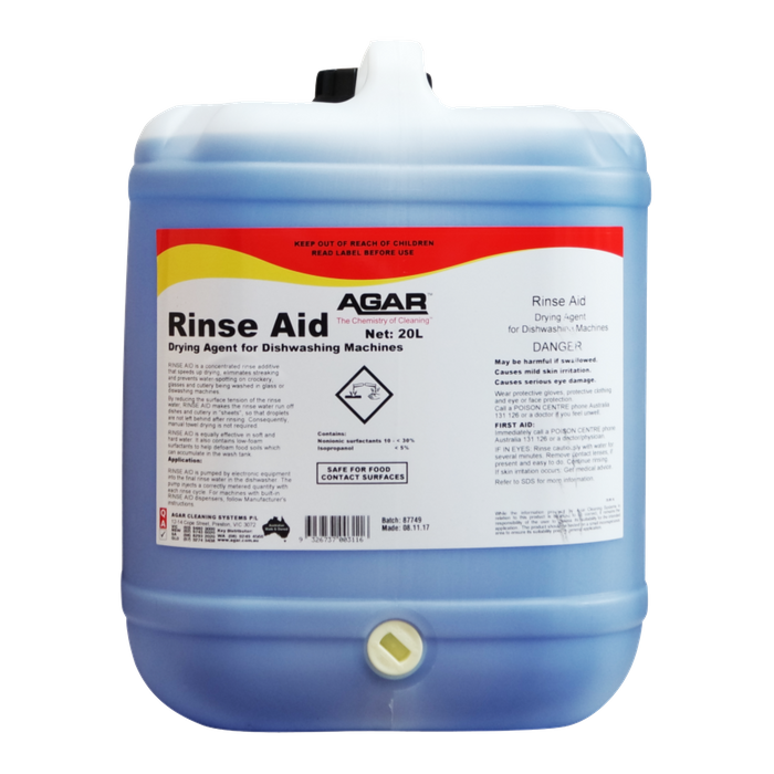 RINSE AID is a concentrated rinse additive that speeds up drying and improves the cleanliness of washed crockery, glasses and cutlery by eliminating streaking and preventing water spotting.