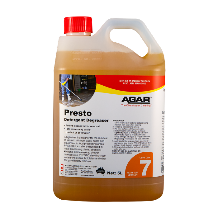 PRESTO is a high-foaming cleaner for the removal of fats and oils from walls, floors, and equipment in food processing areas.
