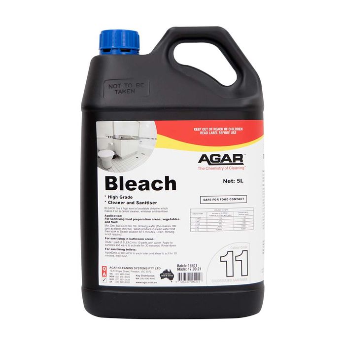 BLEACH is a solution of sodium hypochlorite in water with an available chlorine content of 5% when packed. A very effective method of killing germs, bacteria, etc. which makes it an excellent sanitiser.Also useful in the laundry as a whitening agent.