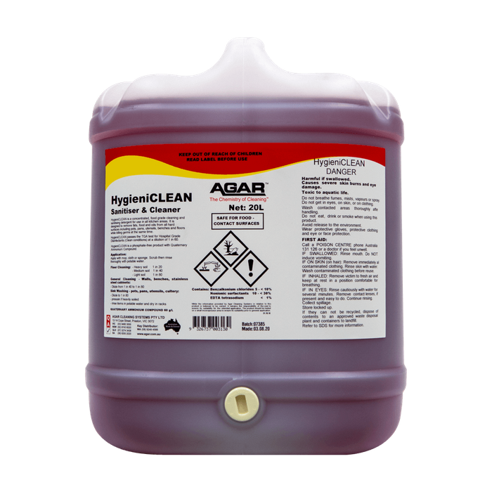 HygieniCLEAN is a concentrated food-grade cleaner & sanitiser for use in kitchens and food processing areas. An excellent cleaner & degreaser for general surface cleaning, sink washing, floor cleaning & for cleaning equipment. TGA approved
