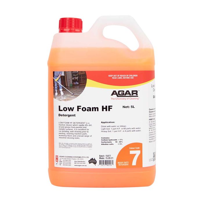 LOW FOAM HF DETERGENT is a reactive cleaner which rapidly lifts dirt, oil and grease from painted and metallic surfaces. It has a very low foam action.