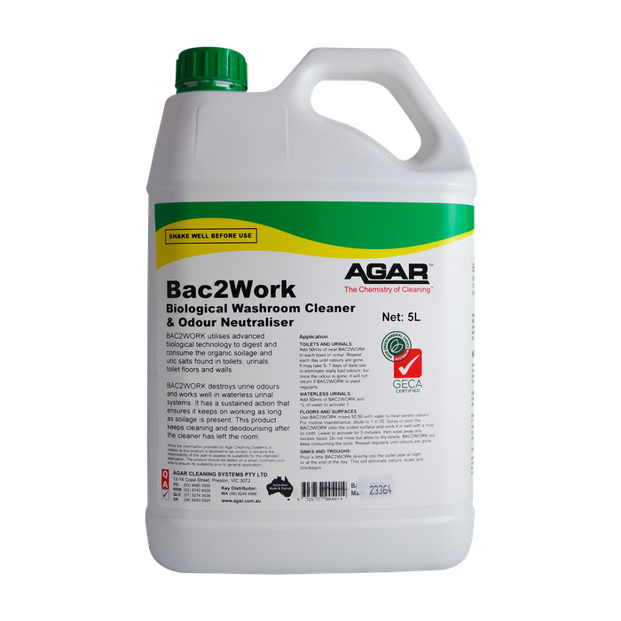 Bac2Work utilises advanced biologically active ingredients to digest & consume the organic soilage & uric acid salts found in & around toilets, urinals, toilet floors & walls. Bac2Work keeps on working as long as soilage is present